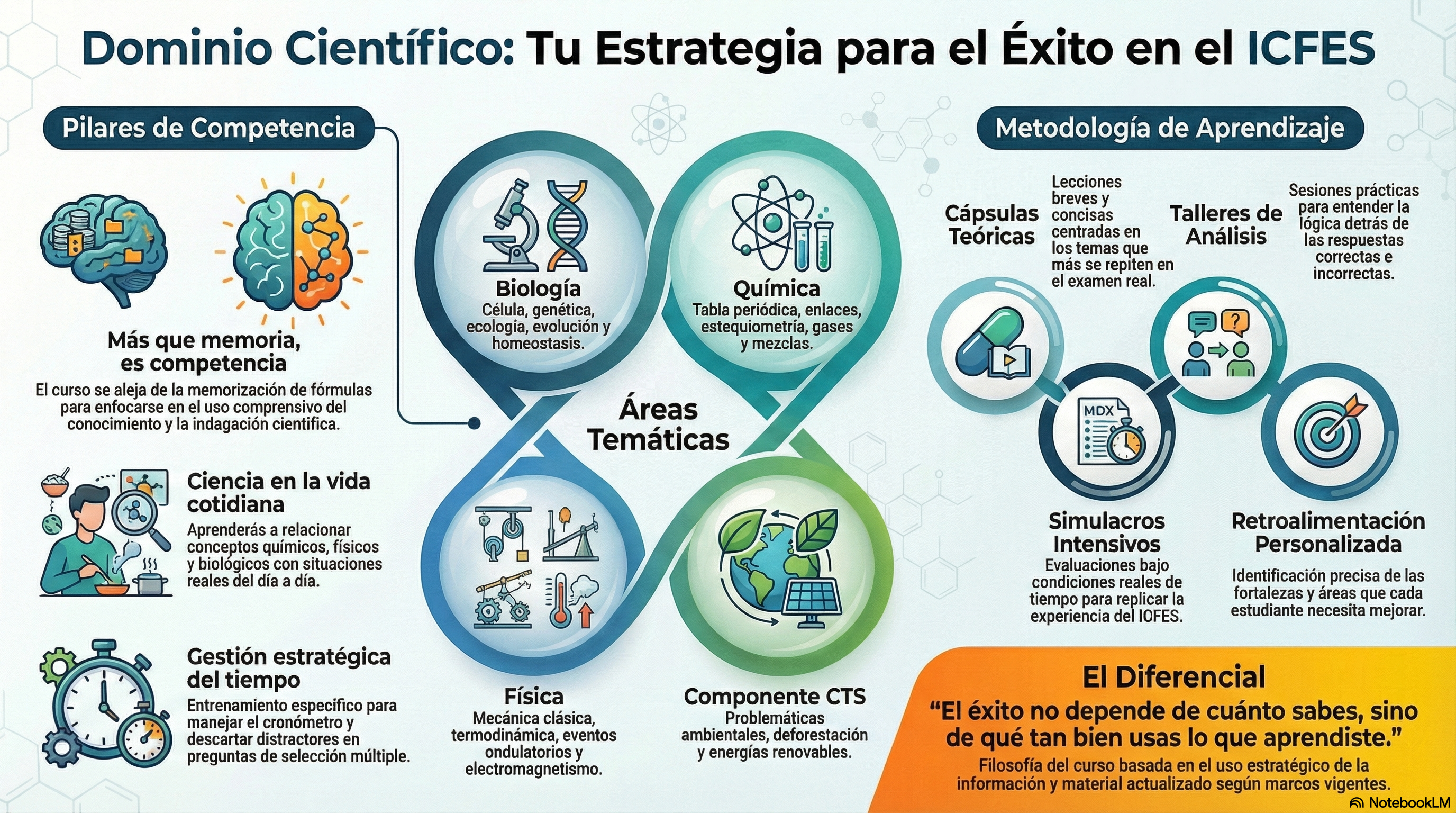 A través de un enfoque práctico y dinámico, desglosaremos los tres pilares fundamentales evaluados por el ICFES: Biología, Física y Química, integrando además el componente de Ciencia, Tecnología y Sociedad (CTS).